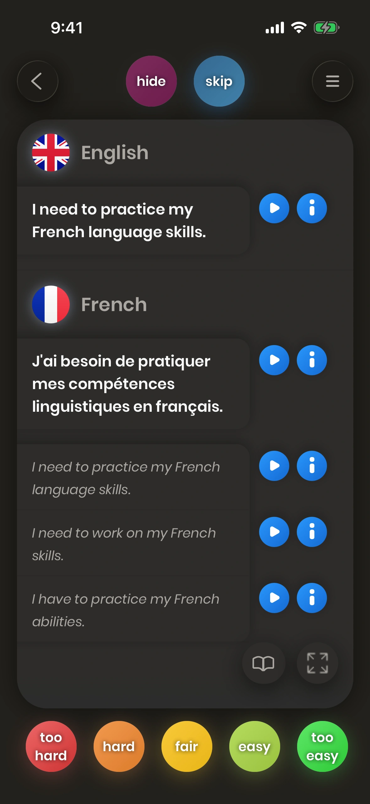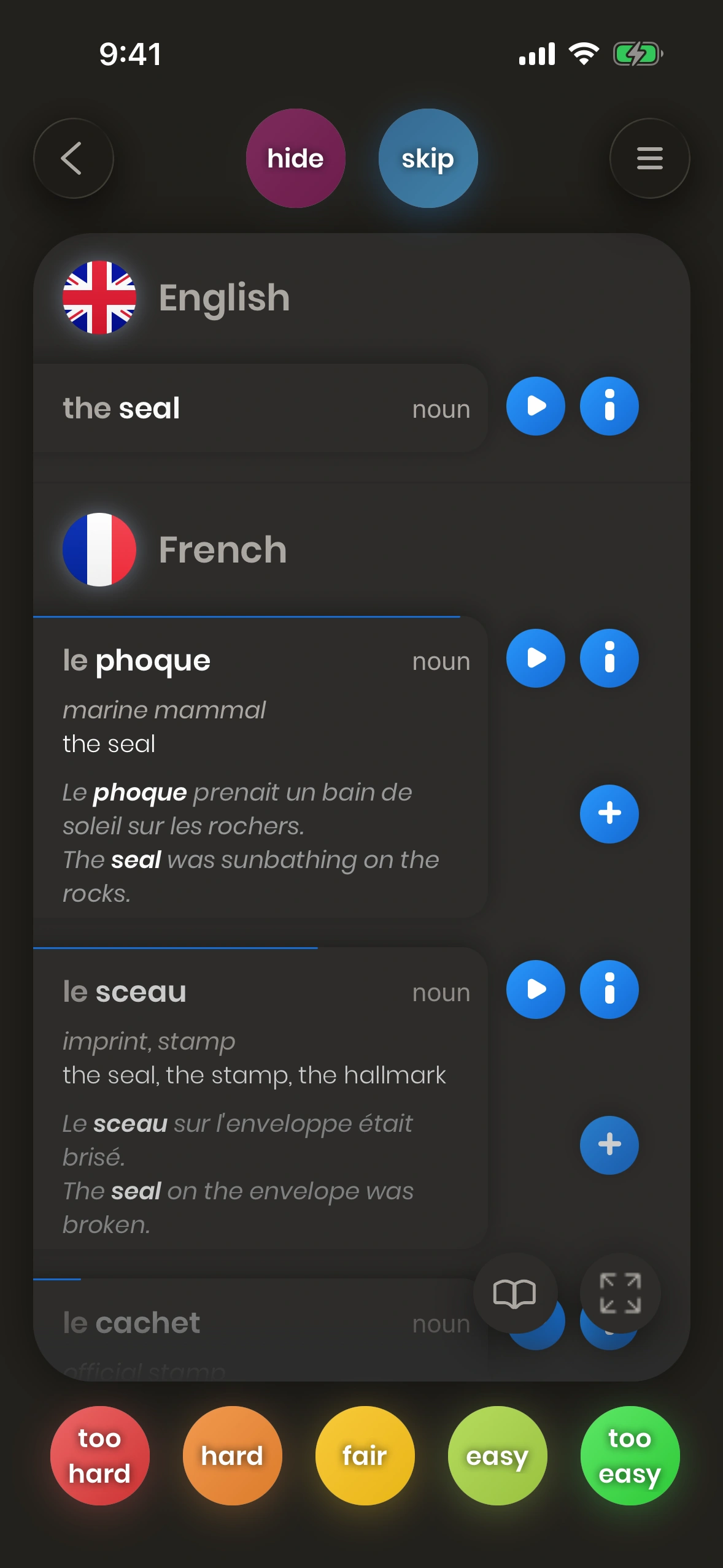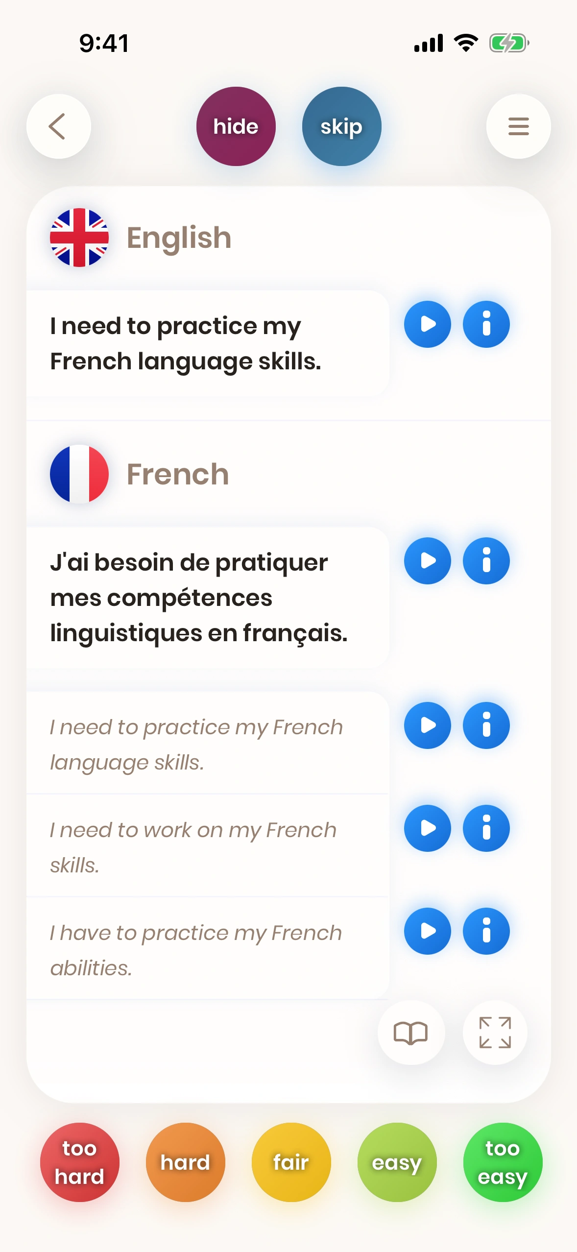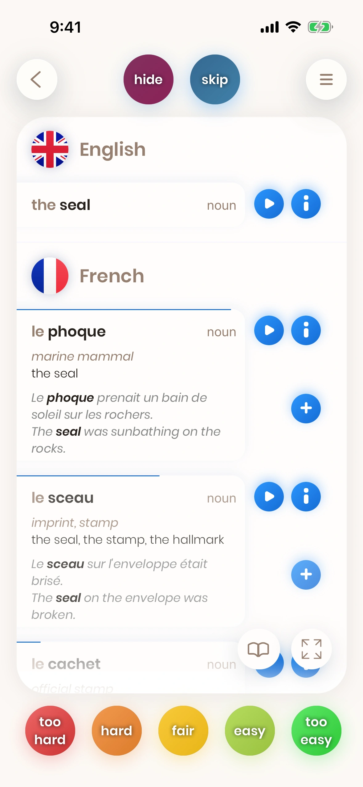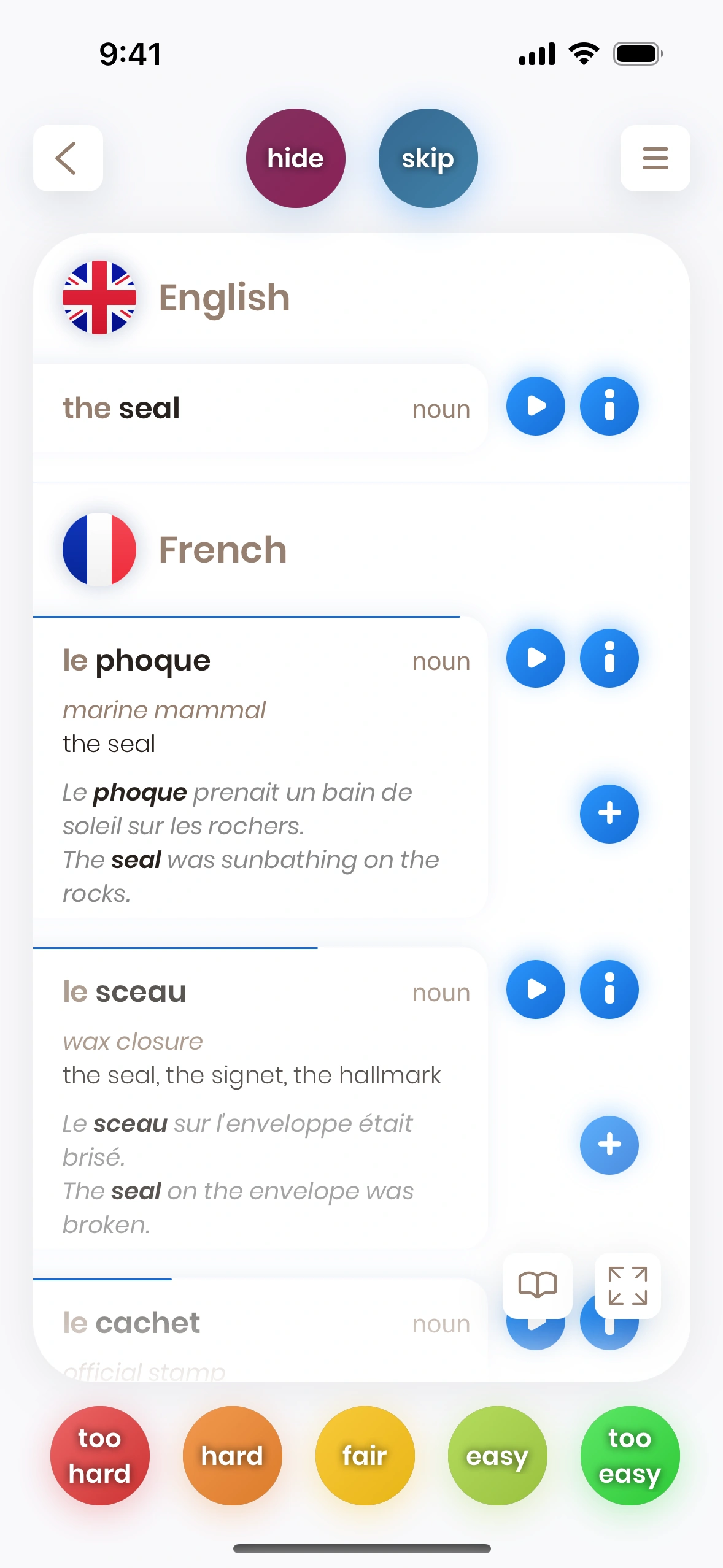 Look at a card. Try to translate the word or phrase. Turn the card. Tell us how difficult it was. Difficult words and phrases are shown again soon.