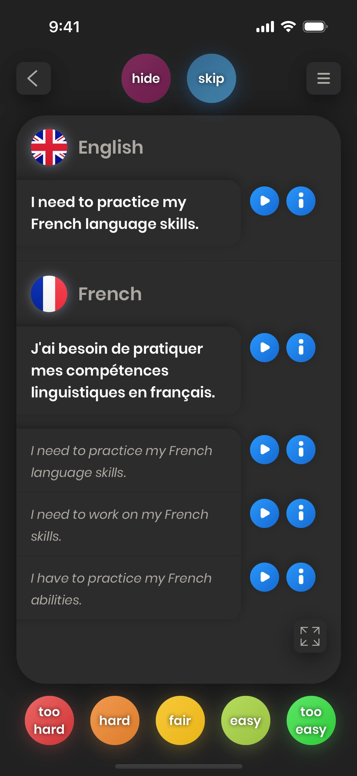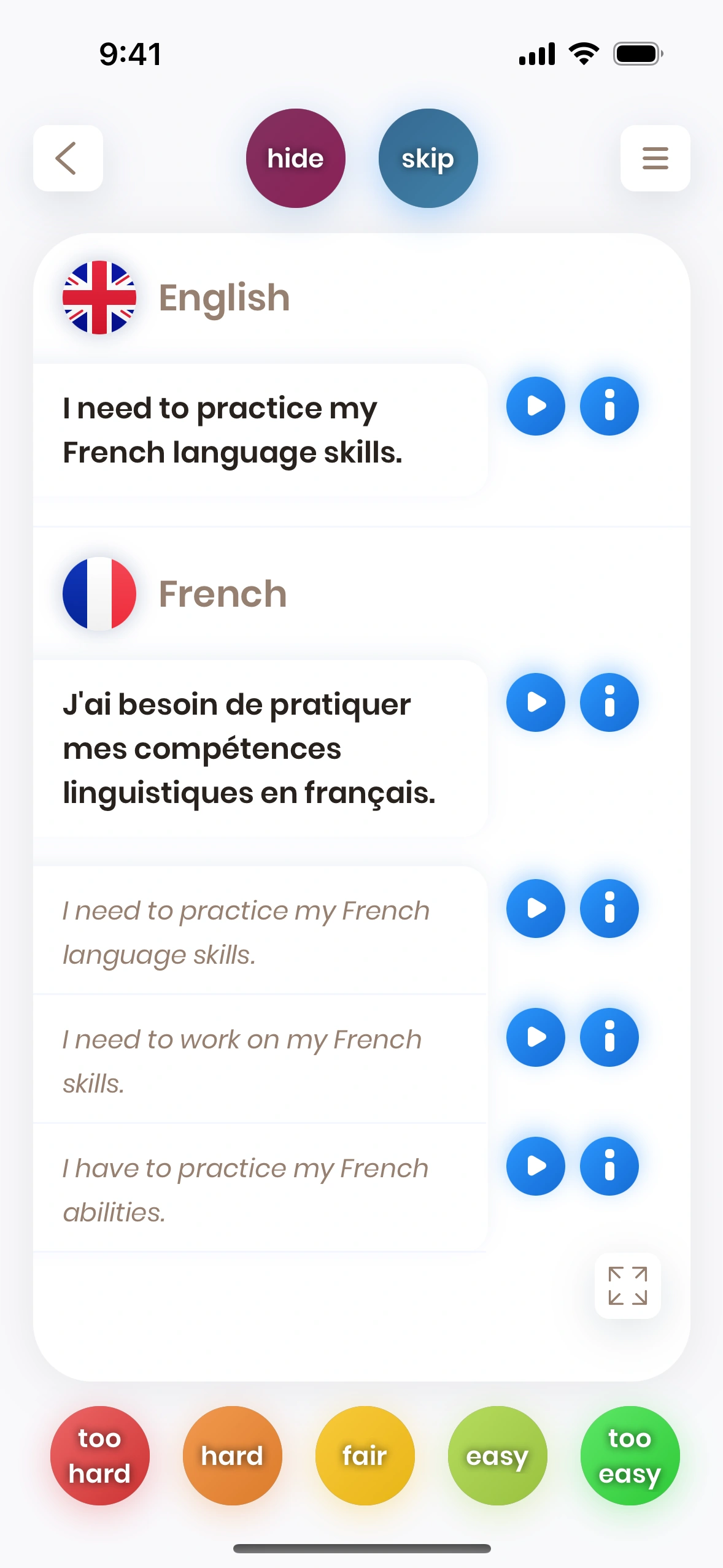 Look at a card. Try to translate the word or phrase. Turn the card. Tell us how difficult it was. Difficult words and phrases are shown again soon.