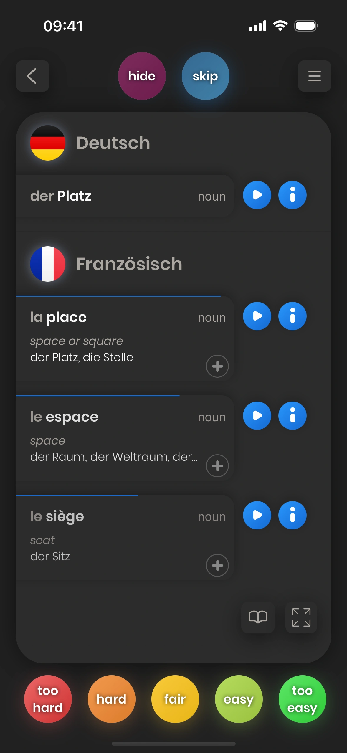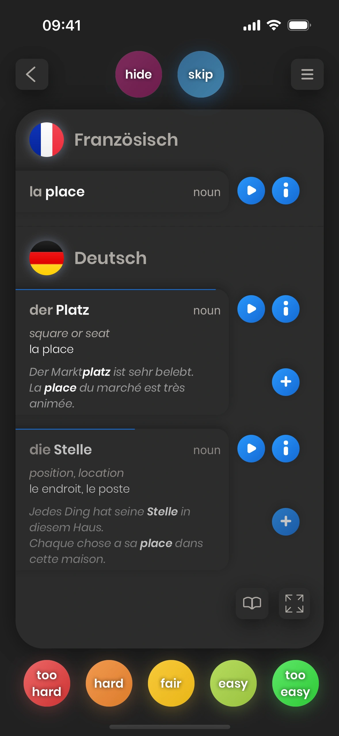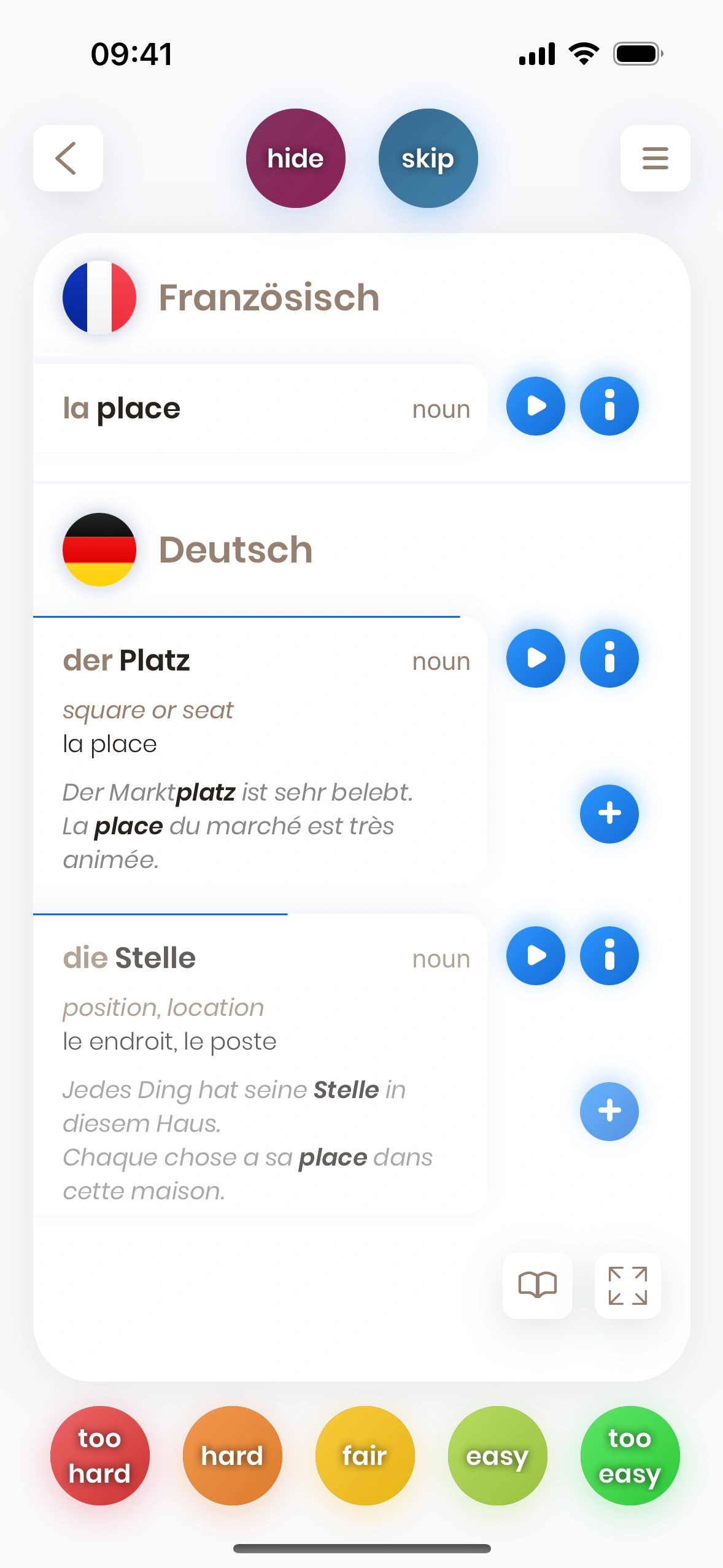 Du musst nicht alle kennen: Kannst du eine der ersten Übersetzungen nennen, gilt die Karte als „gelernt“. Mehr Details später.