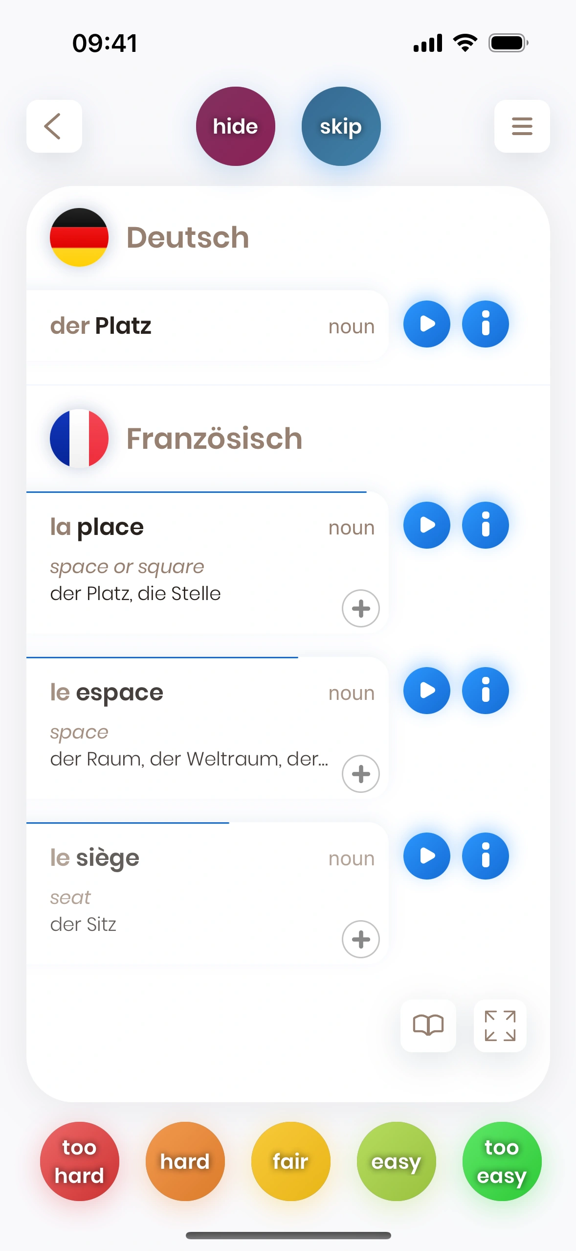 Diese Karten trainieren deinen passiven Wortschatz: Du verstehst französische Wörter, nutzt sie aber vielleicht noch nicht aktiv.