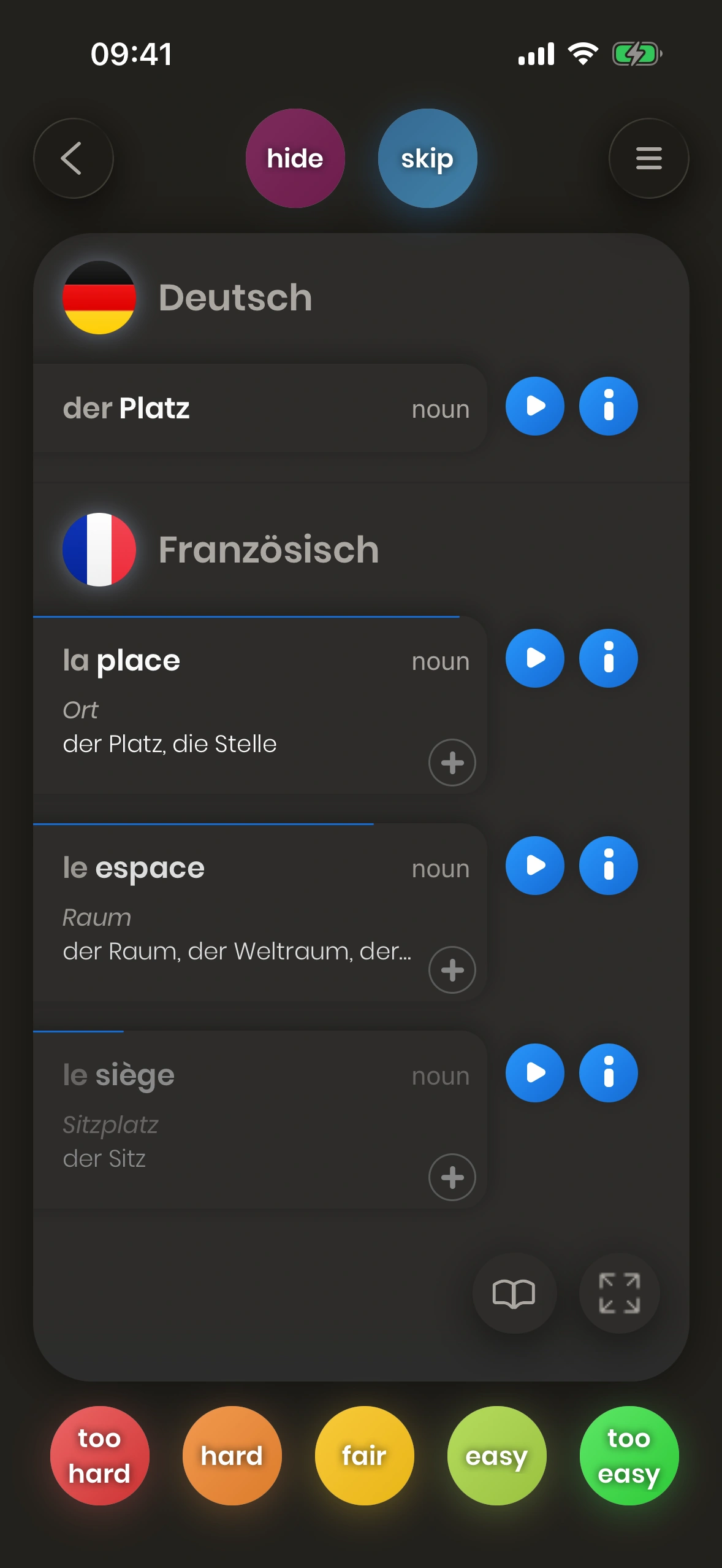 Du musst nicht alle kennen: Kannst du eine der ersten Übersetzungen nennen, gilt die Karte als „gelernt“. Mehr Details später.