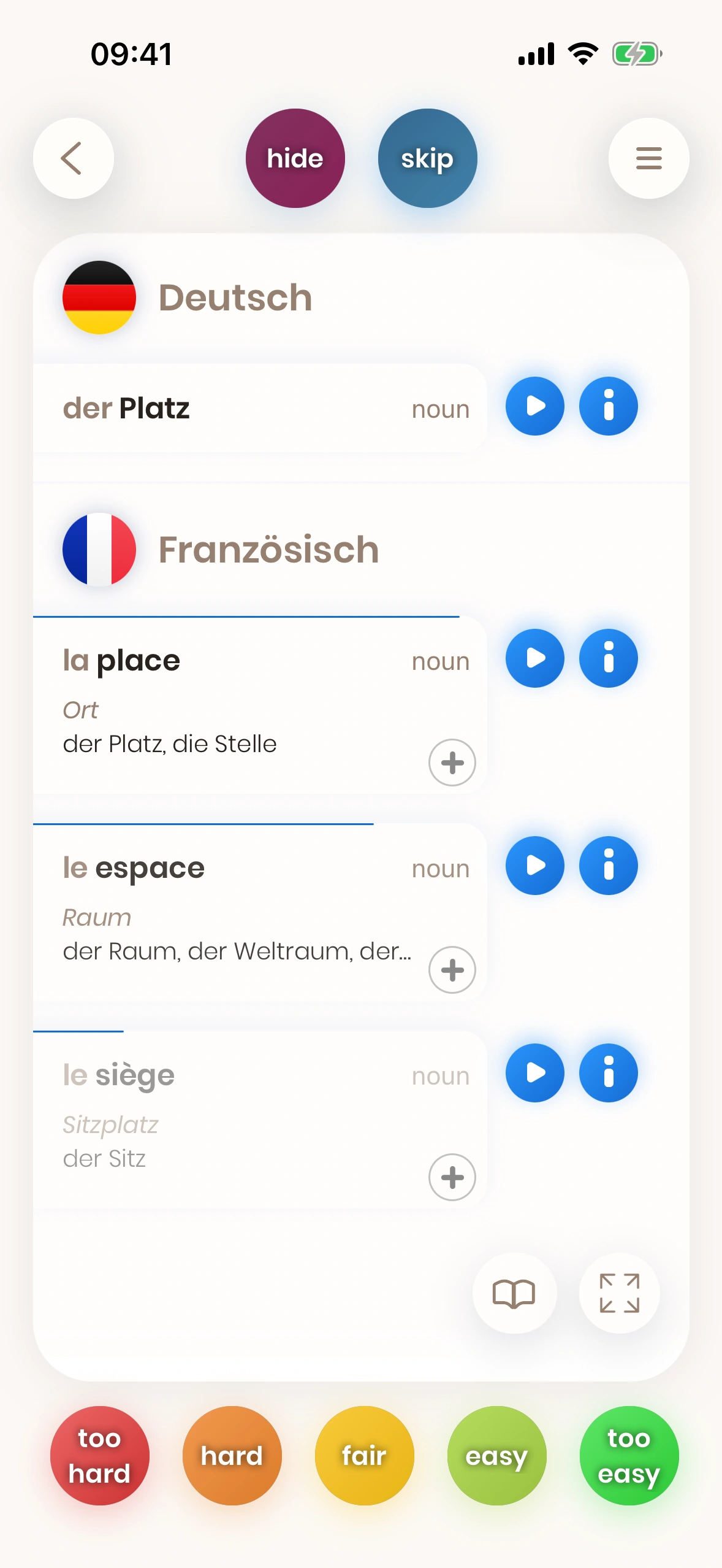 Diese Karten trainieren deinen passiven Wortschatz: Du verstehst französische Wörter, nutzt sie aber vielleicht noch nicht aktiv.