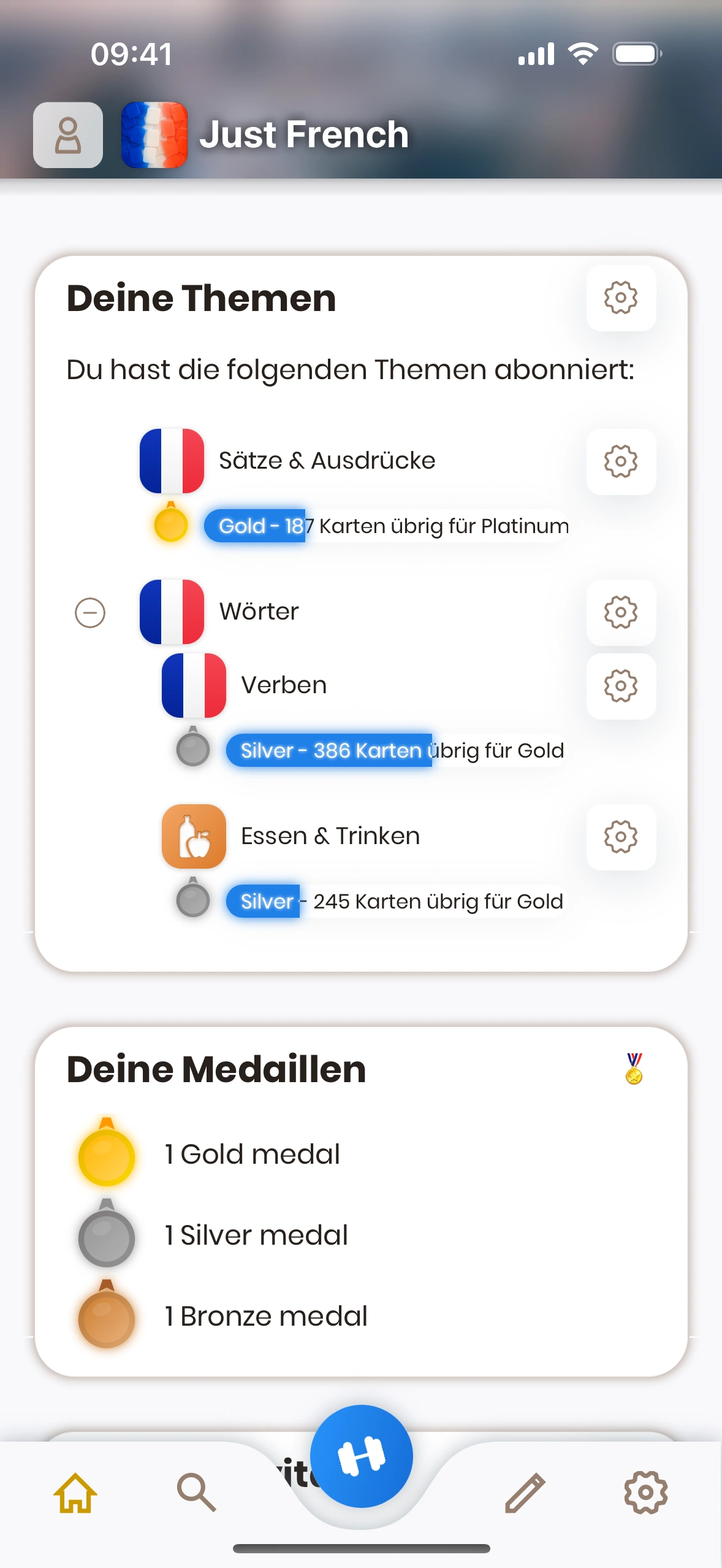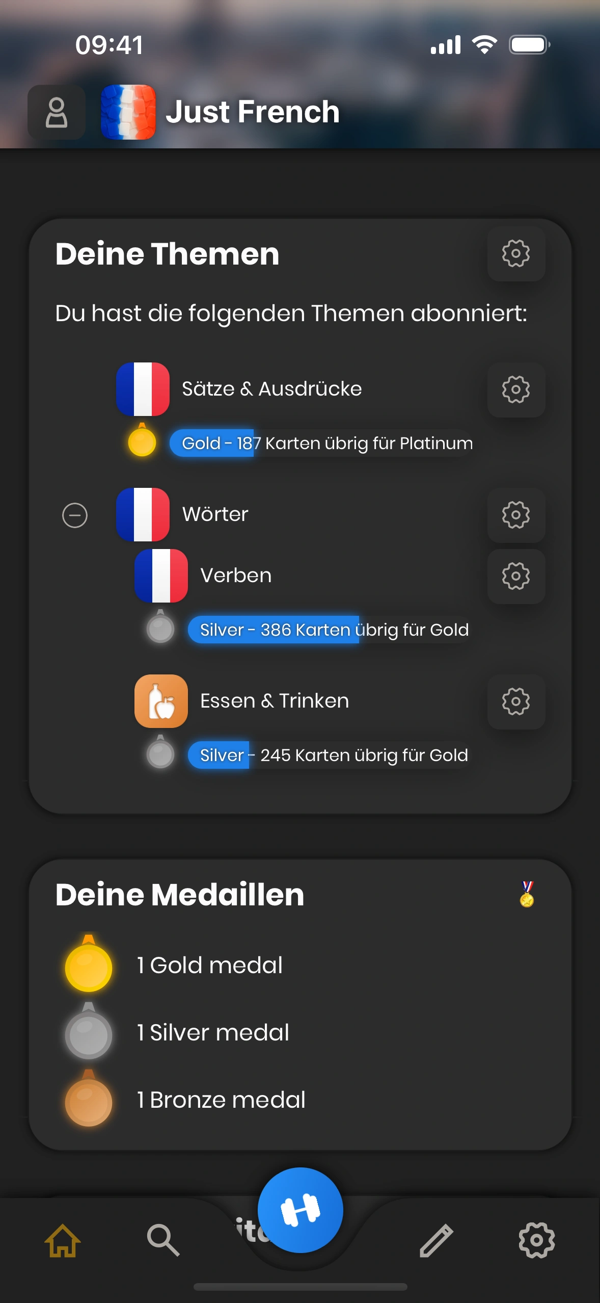 - Einstellungen: Zahnrad tippen, um die Einstellungen zu ändern. which-cards-do-i-learn#new-cards) learned today, as well as your current streak.
