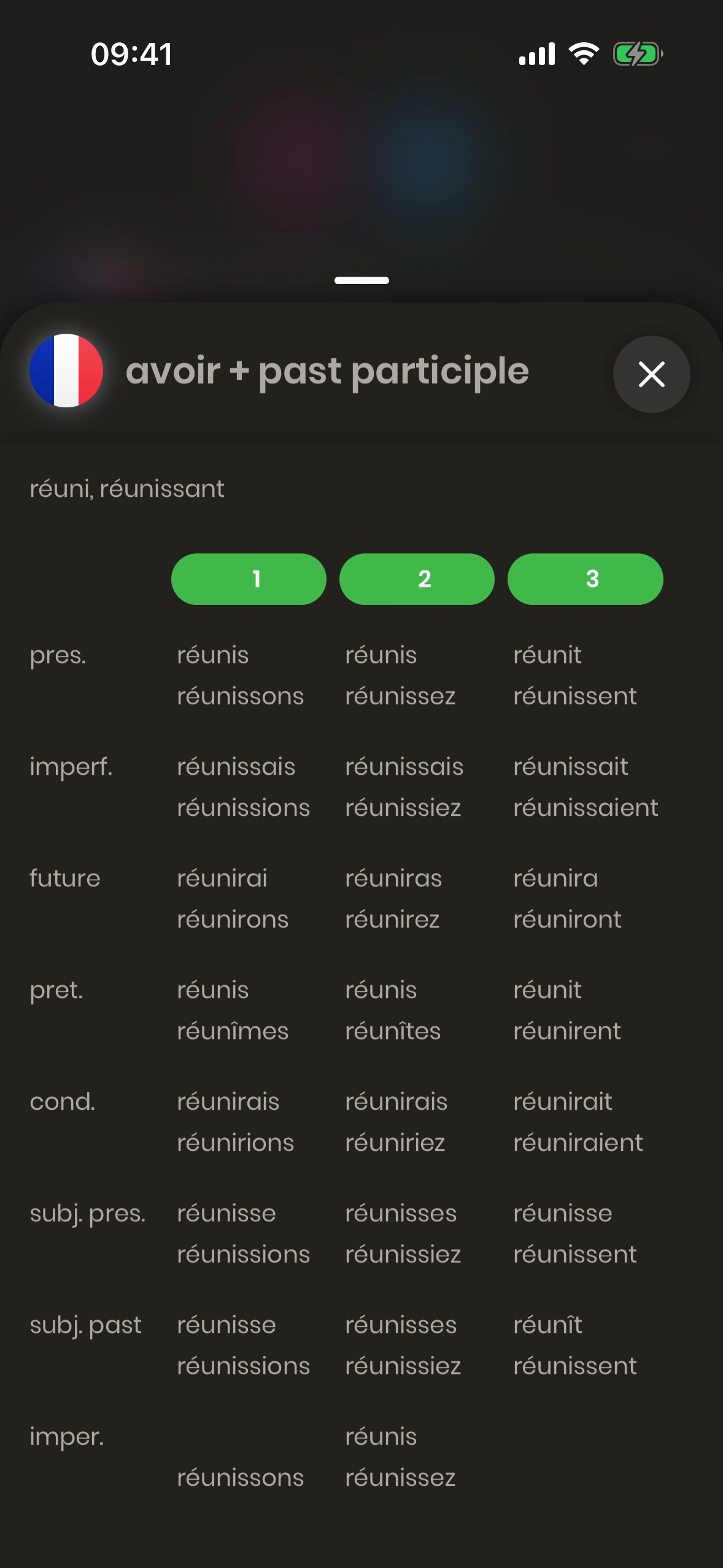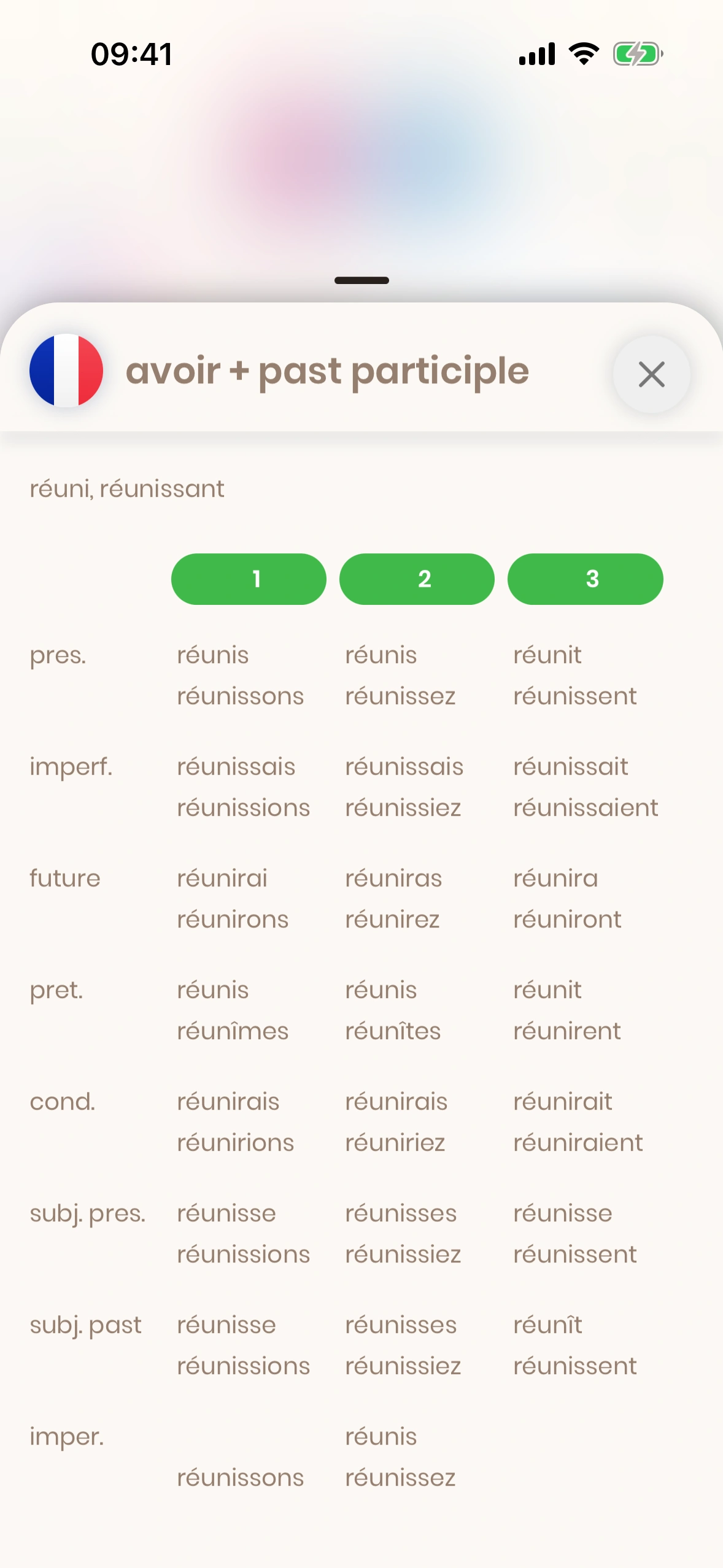 Der Konjugations‑Dialog zeigt die Konjugation eines Verbs. Tippe beim Verb auf den Hinzufügen‑Button und dann auf „Konjugationstabelle".