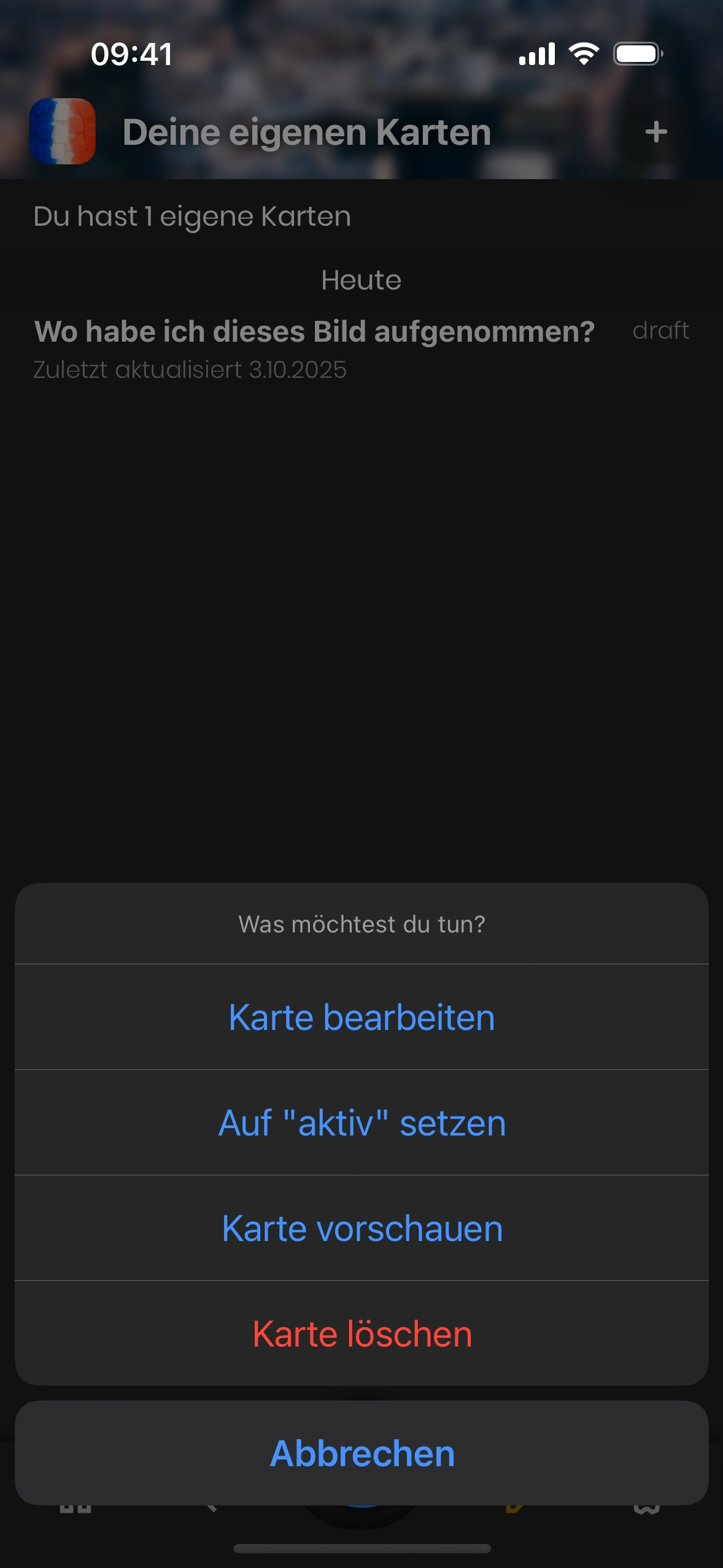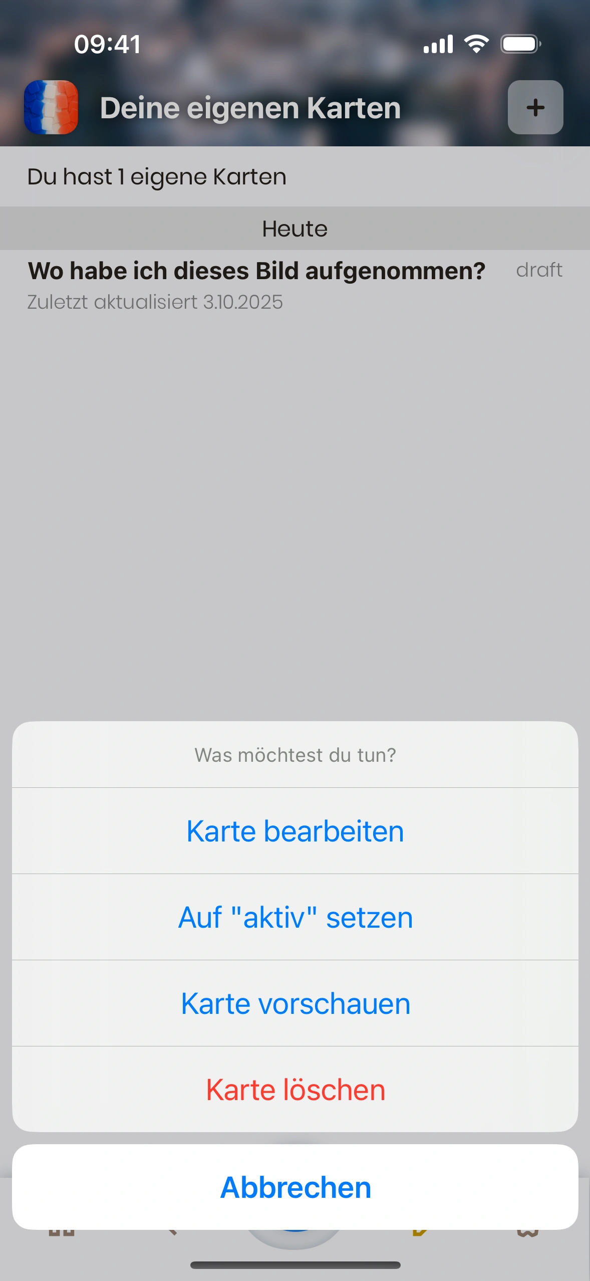 - Kartenstatus: Eine Eigene Karte ist entweder „Entwurf“ oder „Aktiv“. Entwürfe werden beim Lernen nicht gezeigt. Tippe die Karte, um den Status zu ändern.