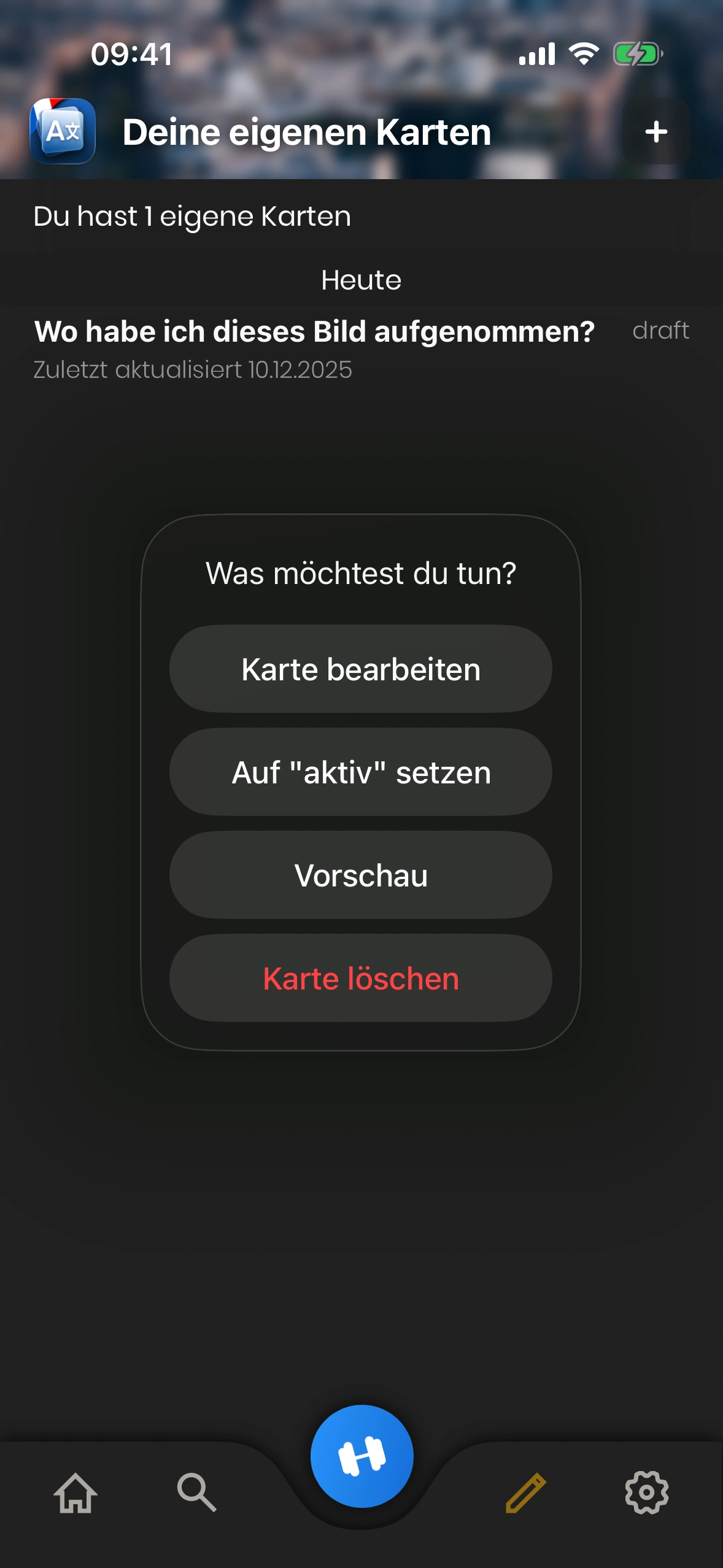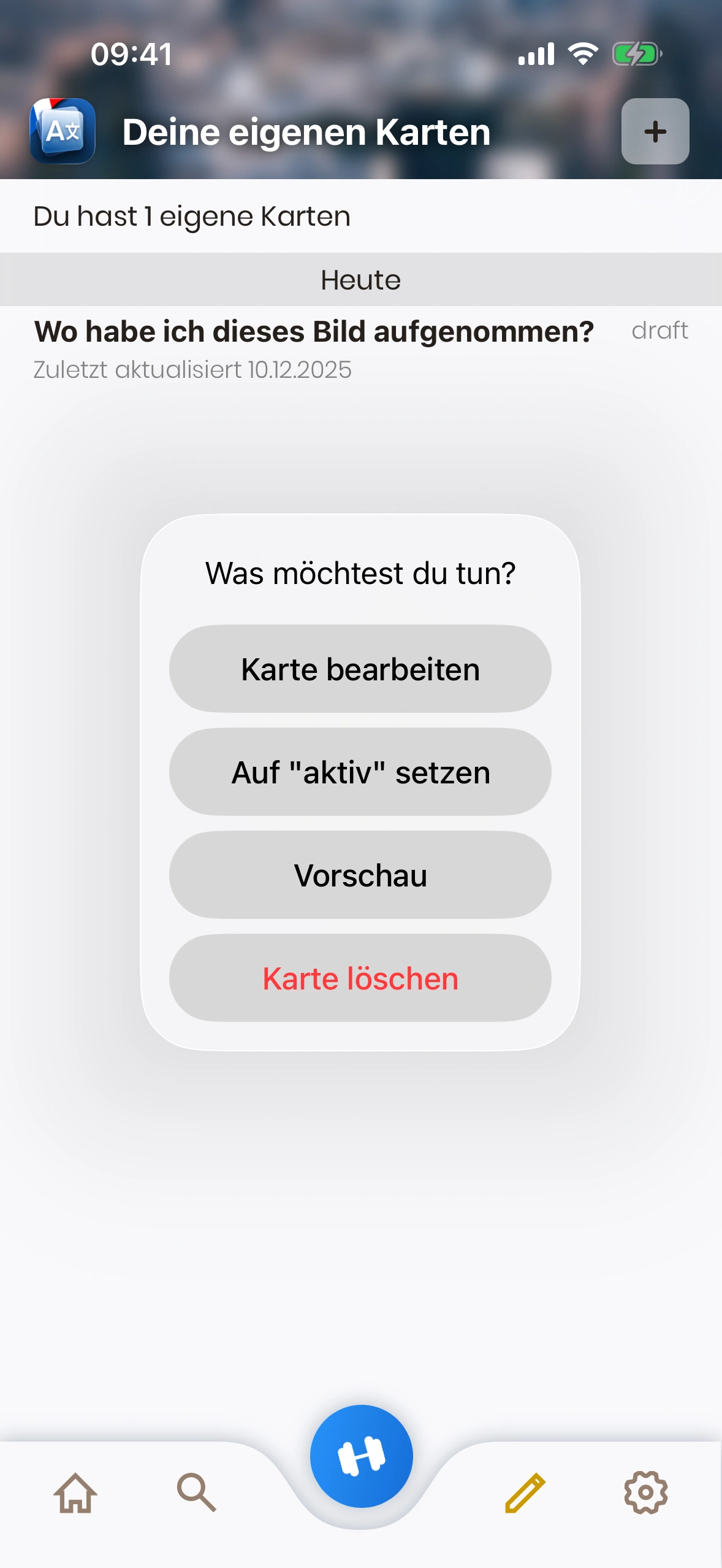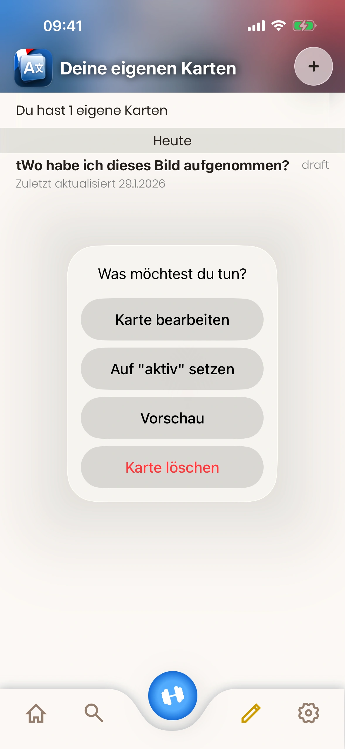 - Kartenstatus: Eine Eigene Karte ist entweder „Entwurf“ oder „Aktiv“. Entwürfe werden beim Lernen nicht gezeigt. Tippe die Karte, um den Status zu ändern.