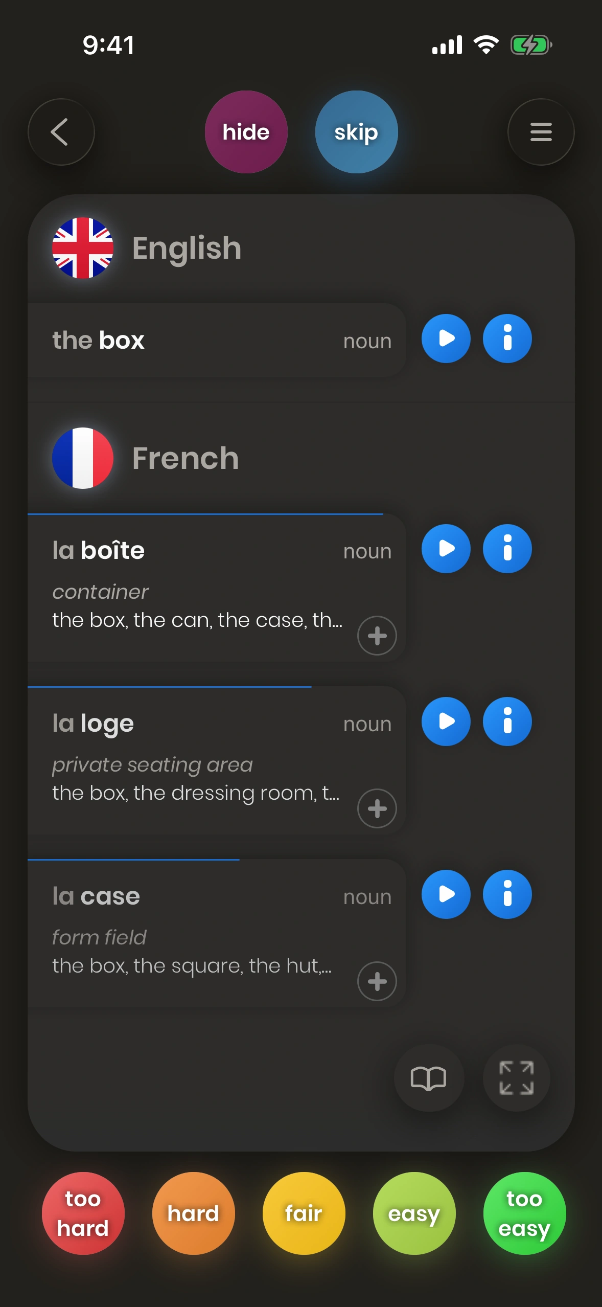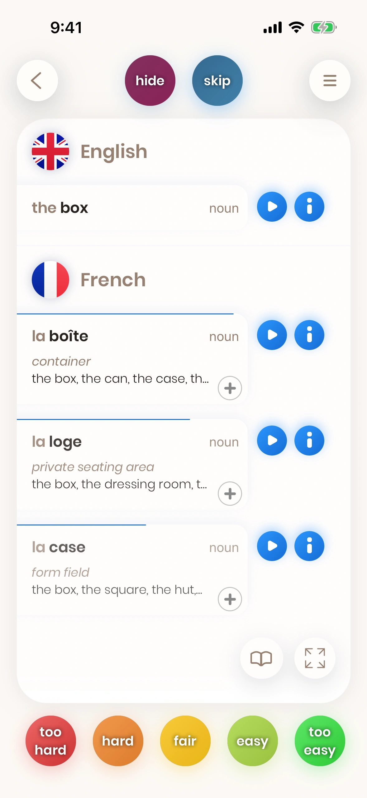 An English-to-French card shows you an English word, and lets you translate it into French.