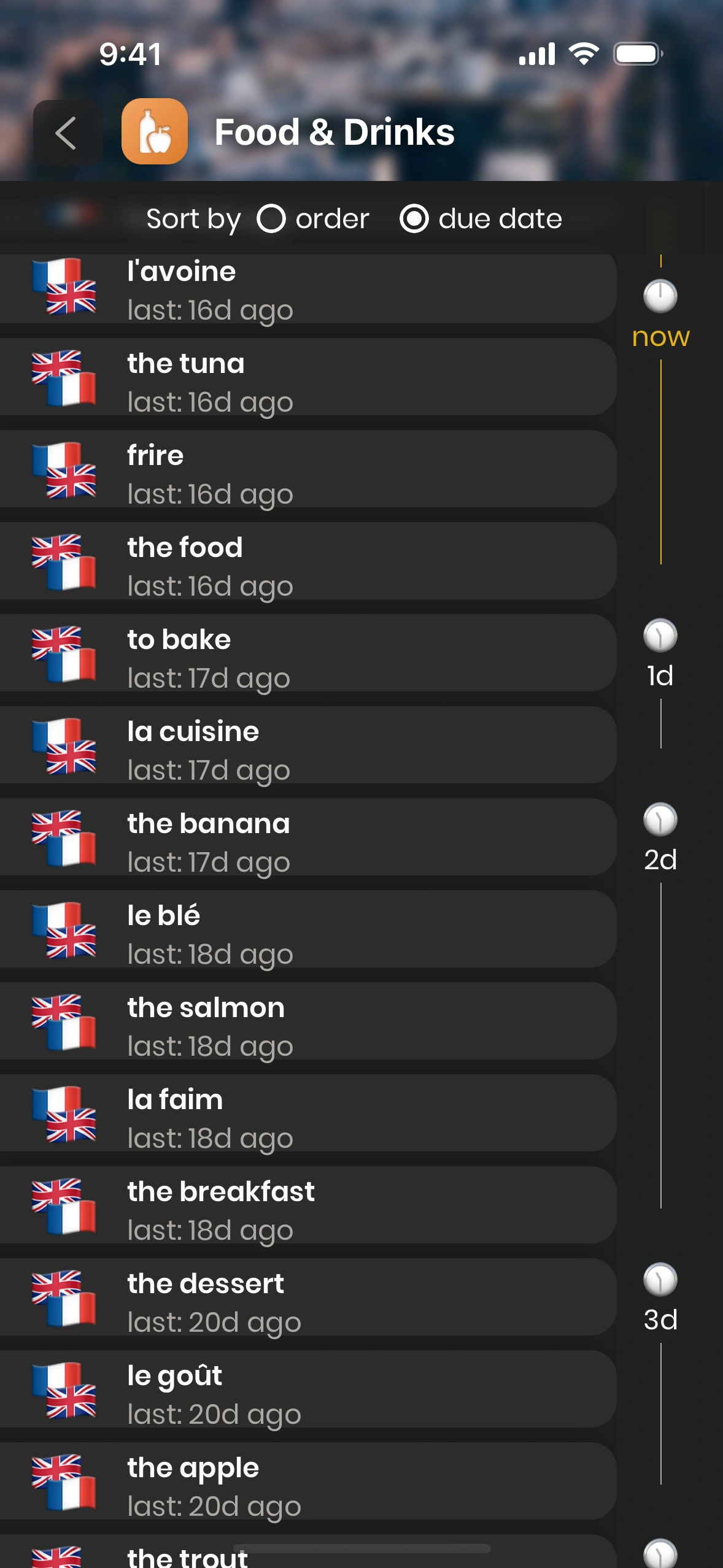 - Due date: If this card is already in your learning queue, then this shows when you should review it next. "Now" means that the card will be displayed in one of the next learning sessions (as soon as you have learned all cards with a higher urgency).