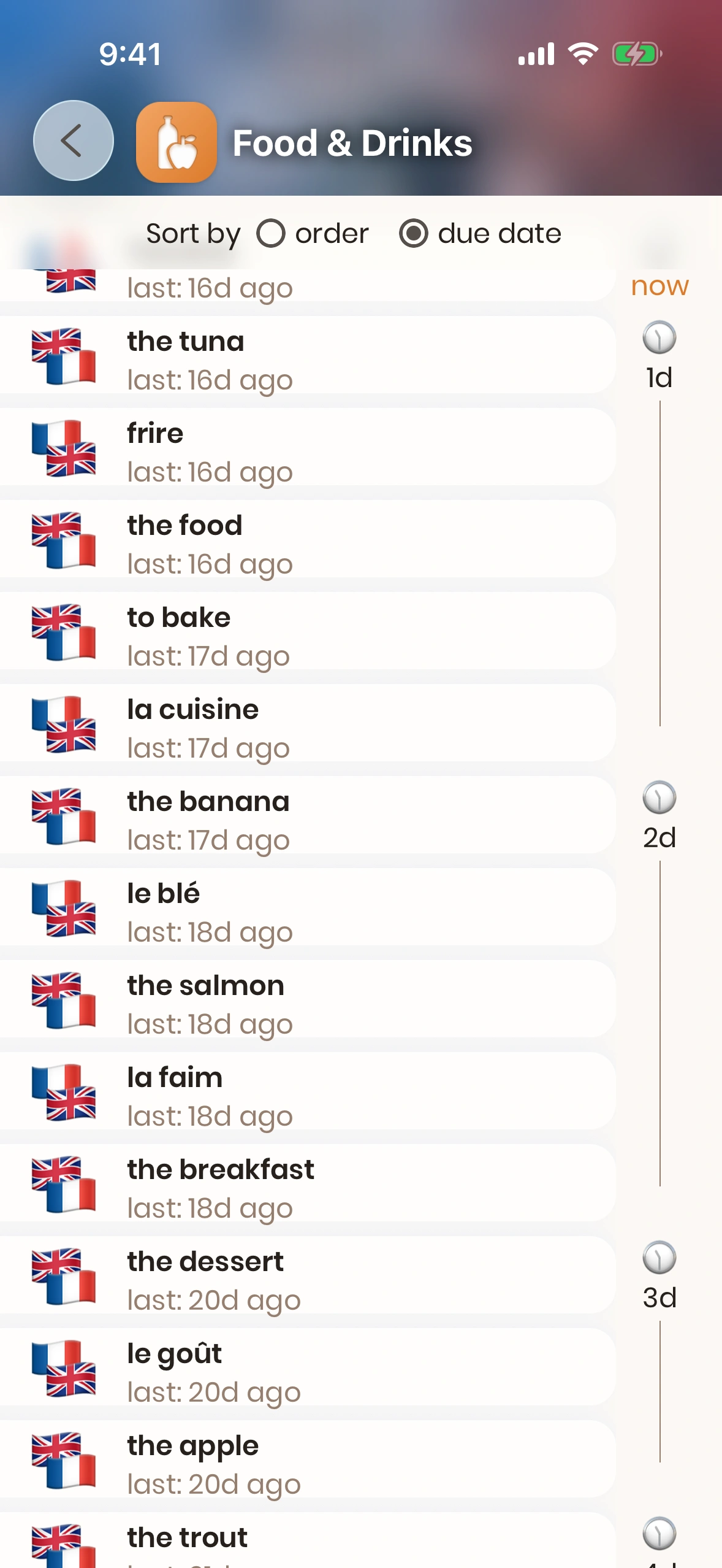 - Due date: If this card is already in your learning queue, then this shows when you should review it next. "Now" means that the card will be displayed in one of the next learning sessions (as soon as you have learned all cards with a higher urgency).
