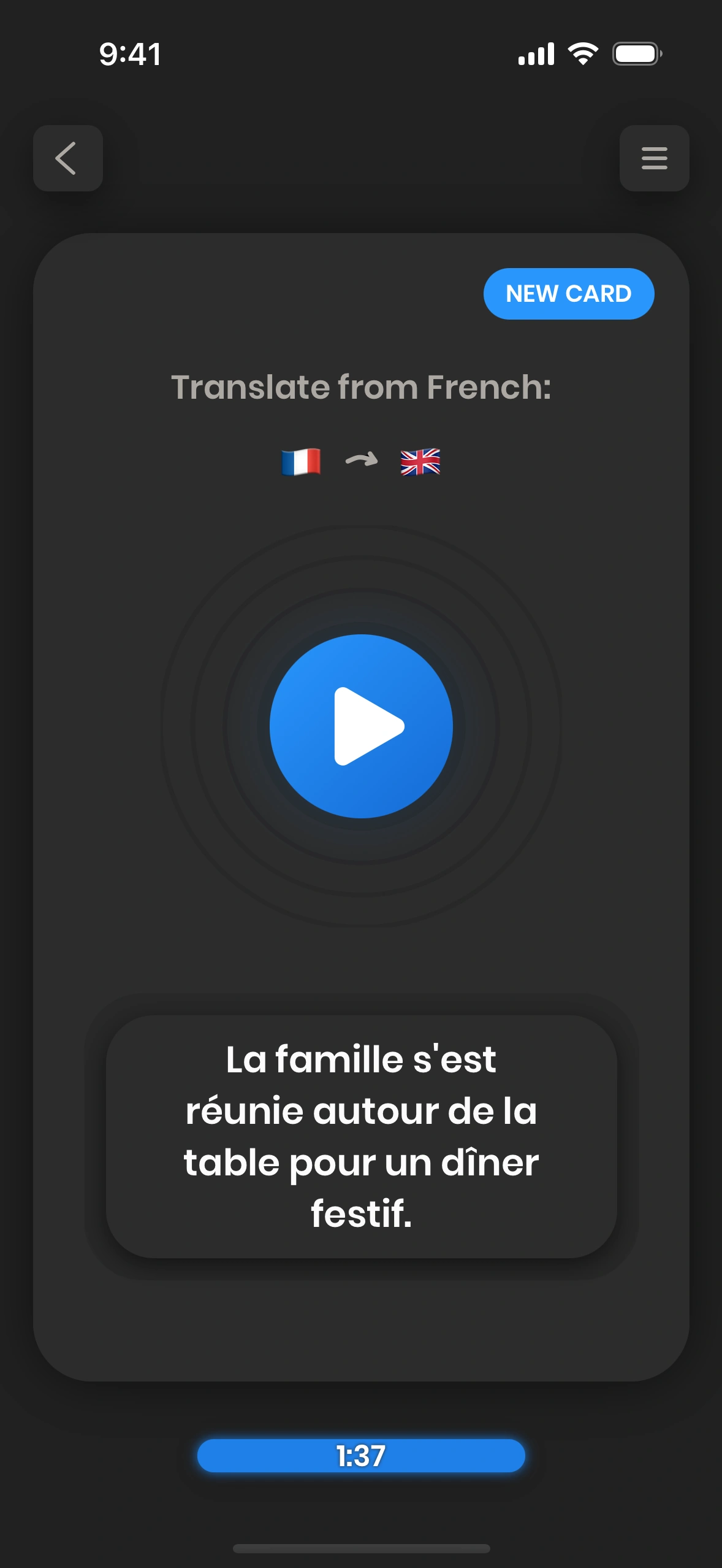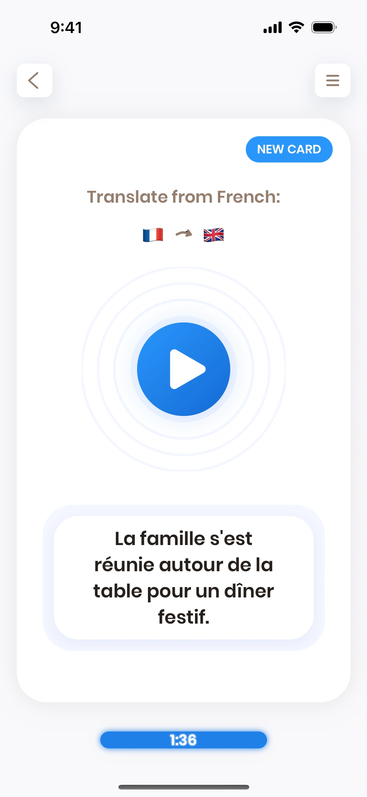 - The card invites you to translate a word or a phrase. You try to do that.