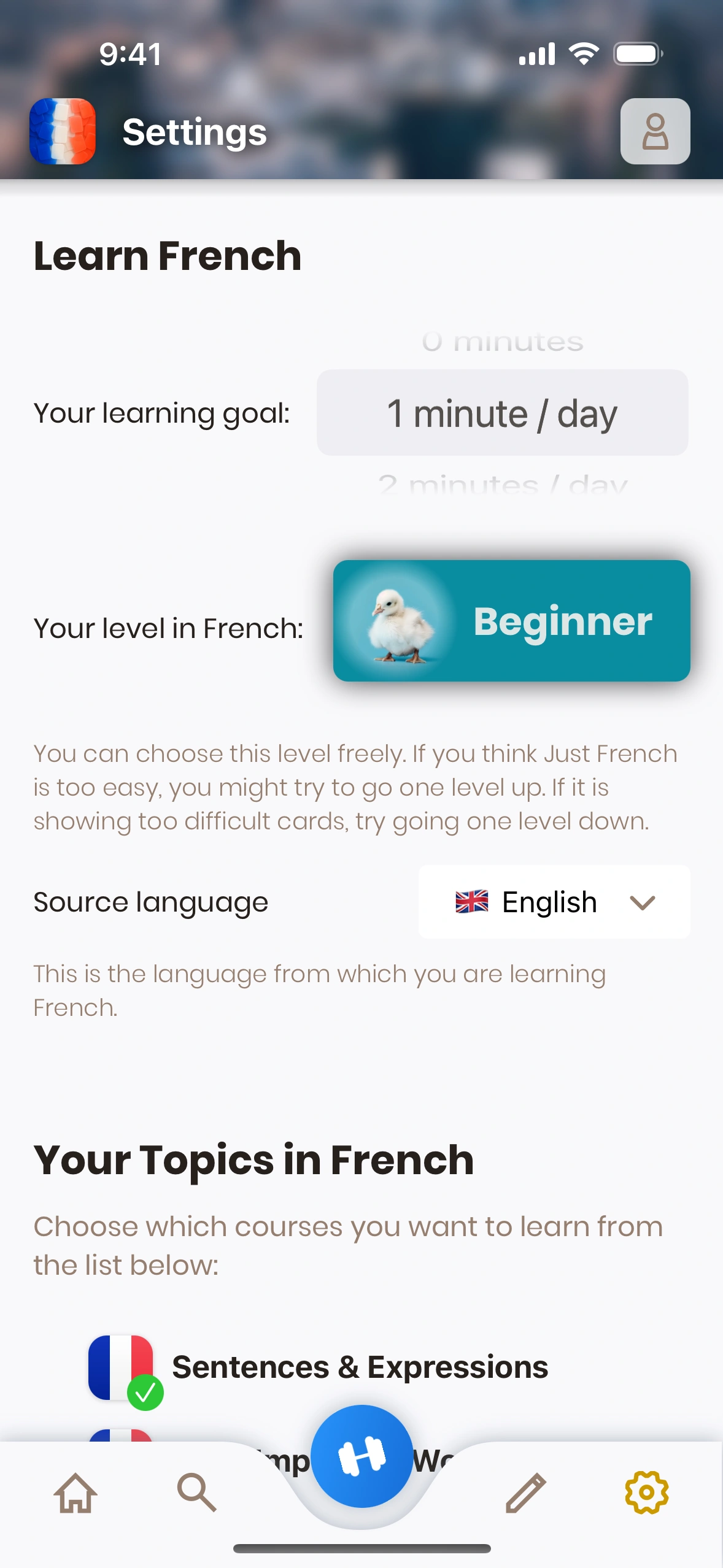 If you feel like Just French is showing you cards that are too easy (or too repetitive) or too difficult, then it might make sense to change the language level.