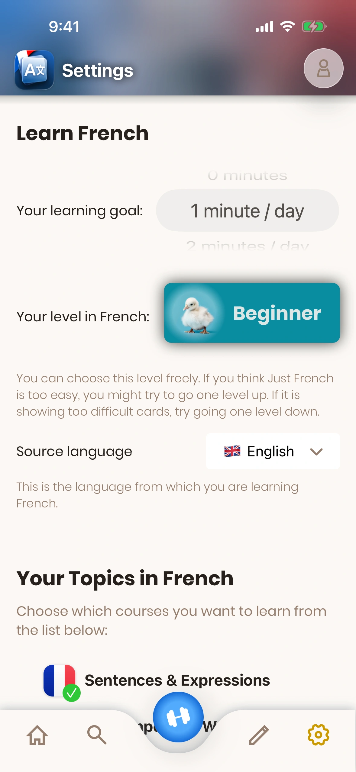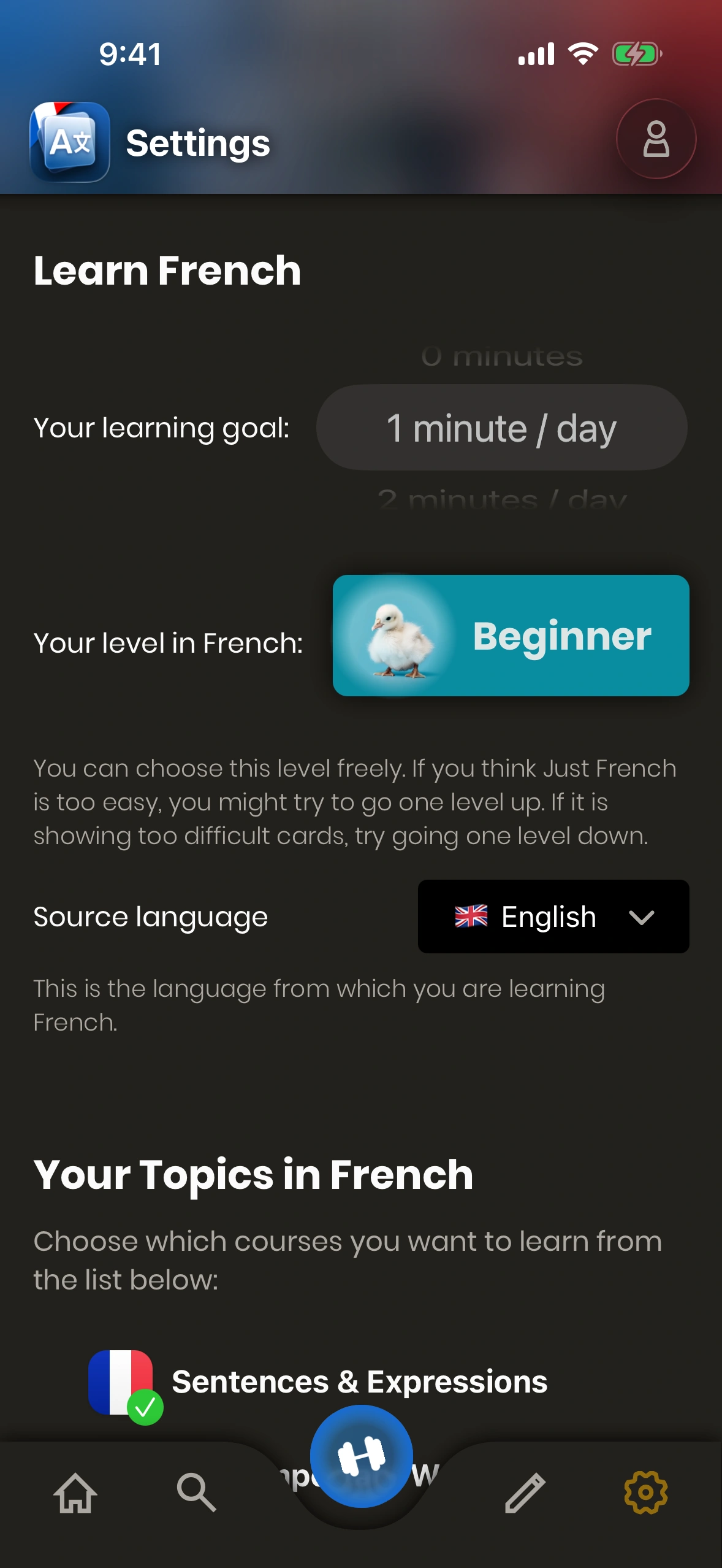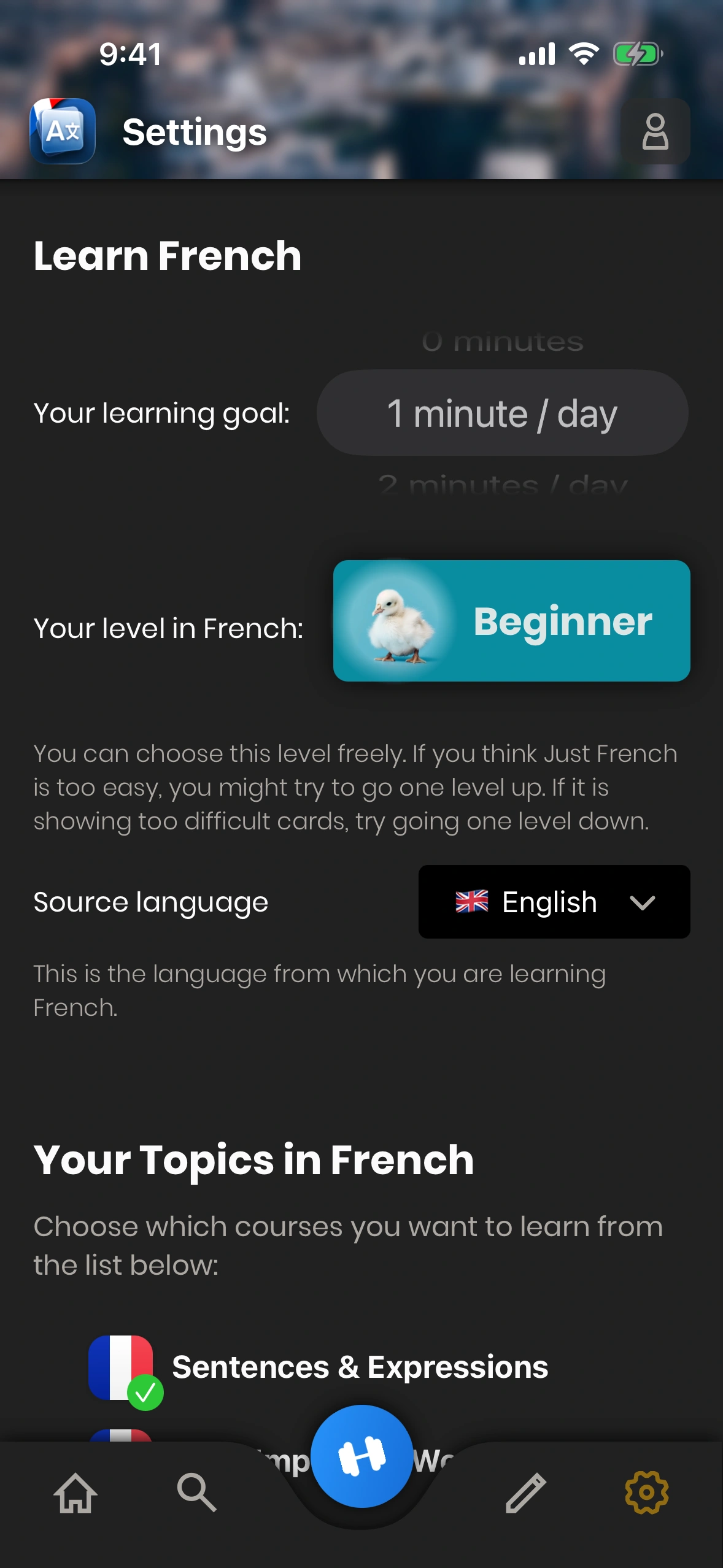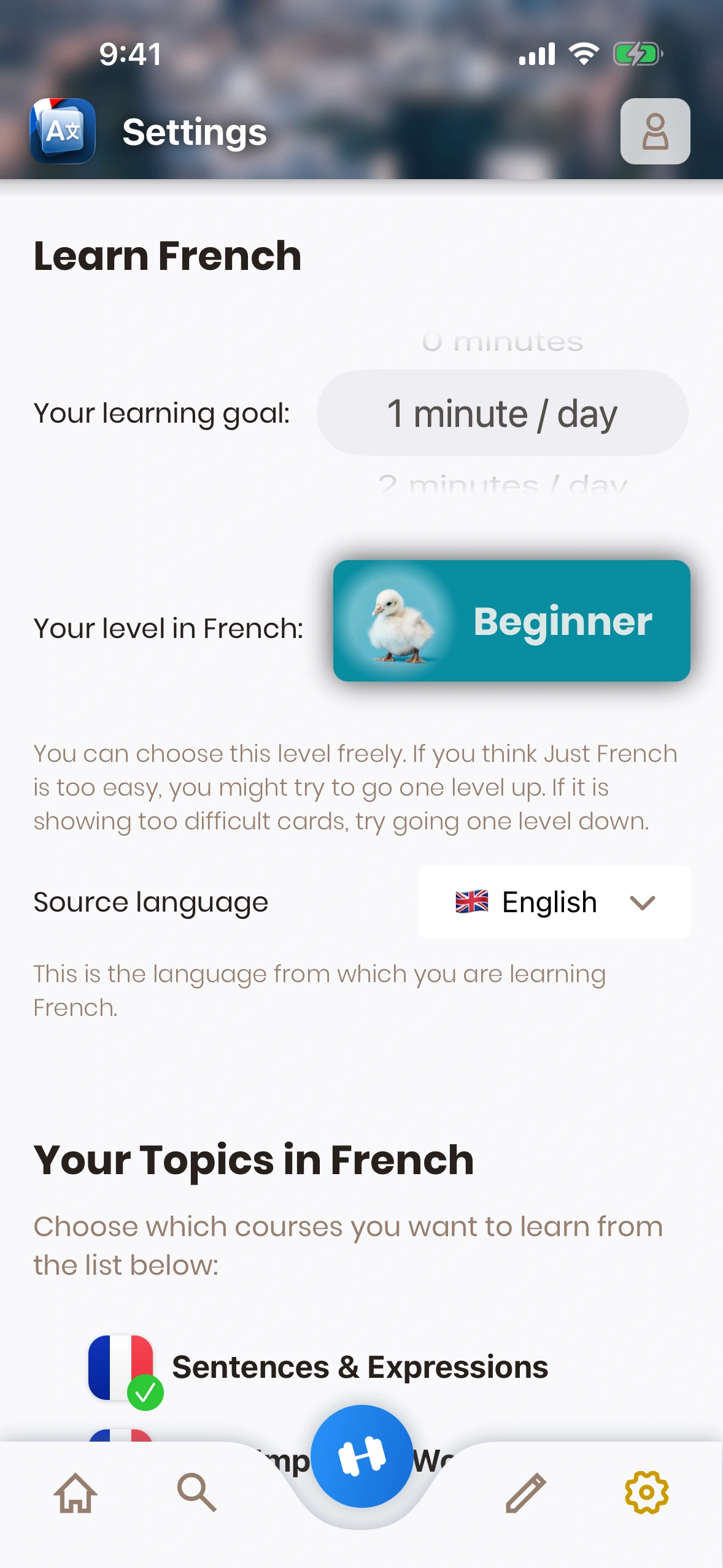 If you feel like Just French is showing you cards that are too easy (or too repetitive) or too difficult, then it might make sense to change the language level.